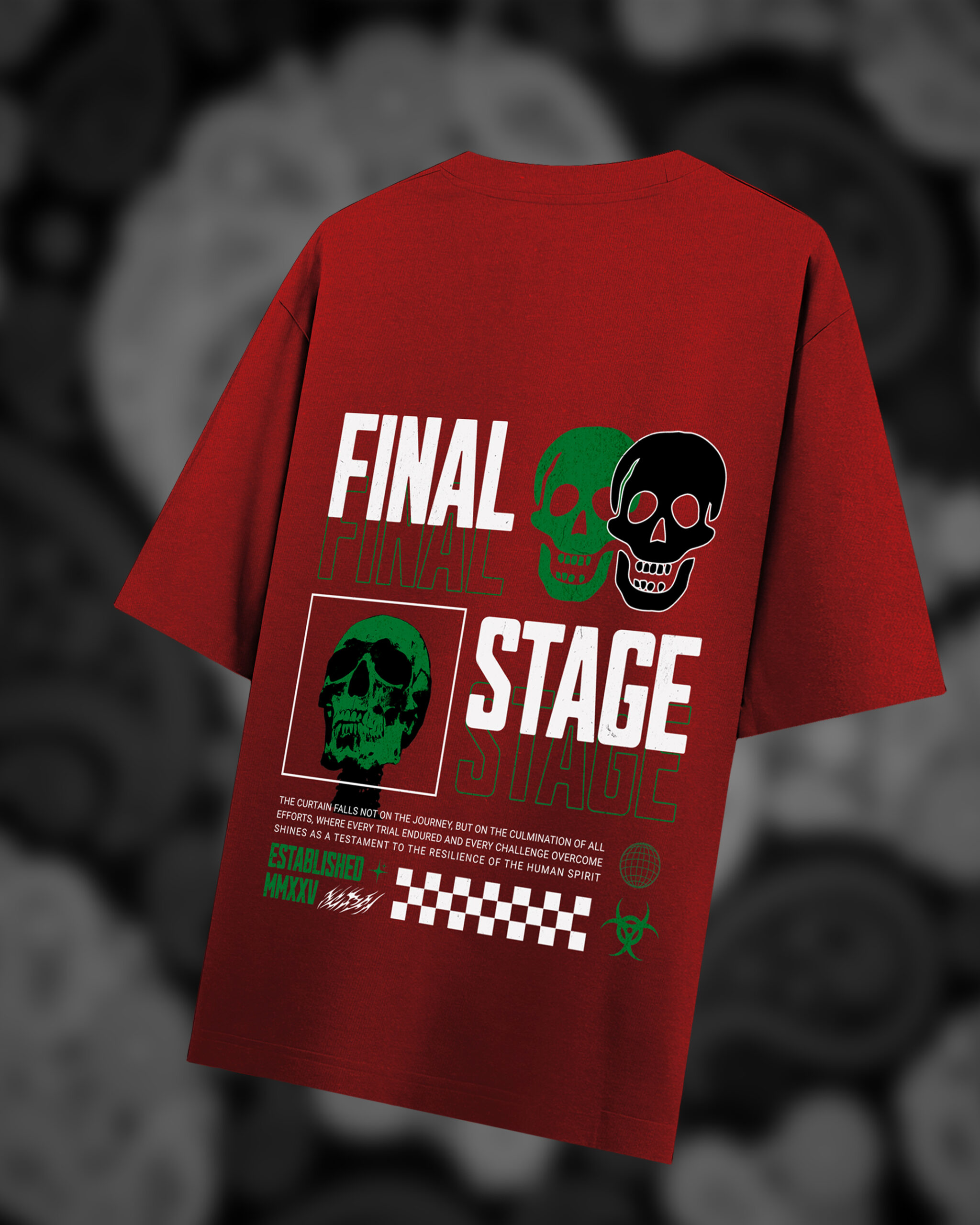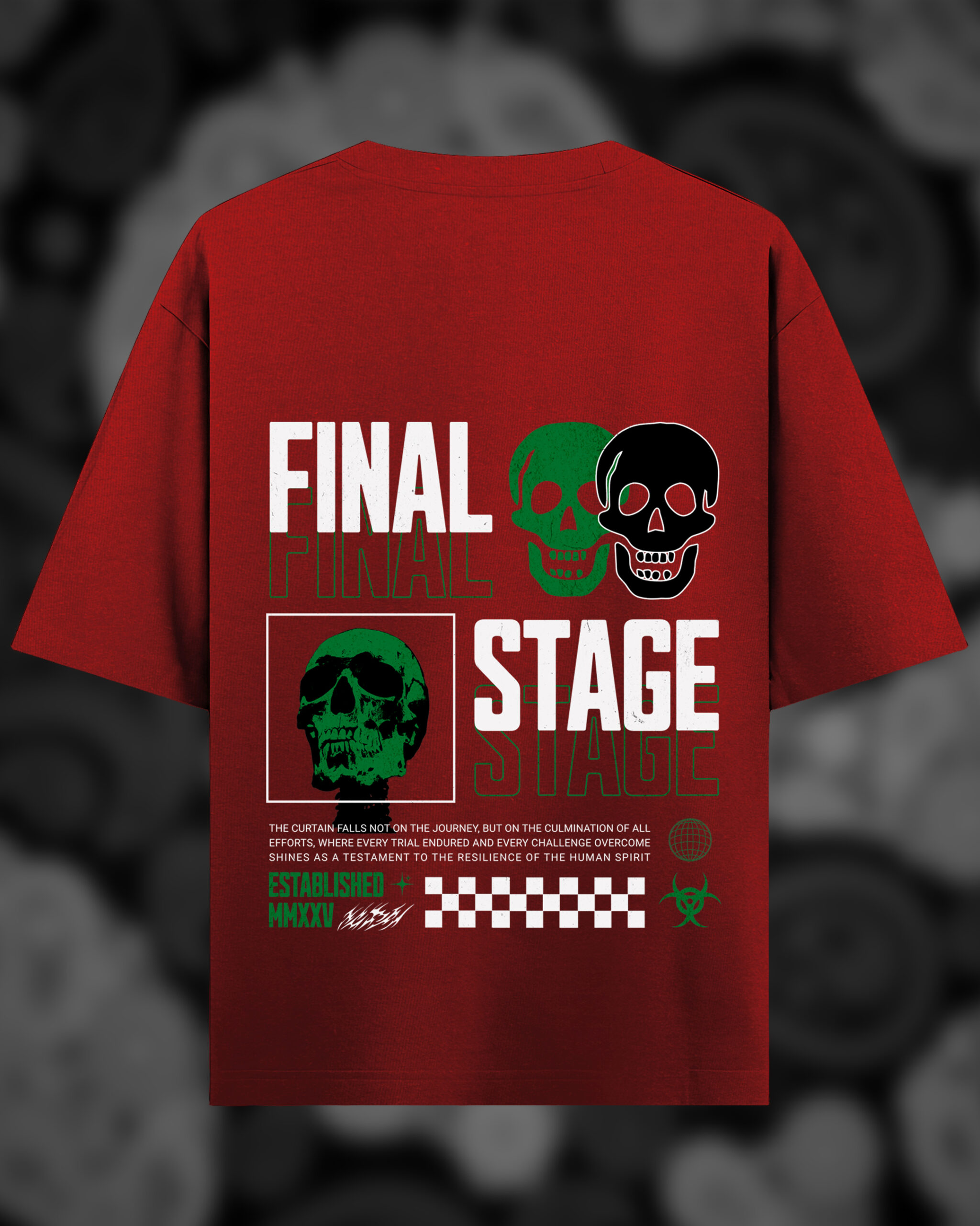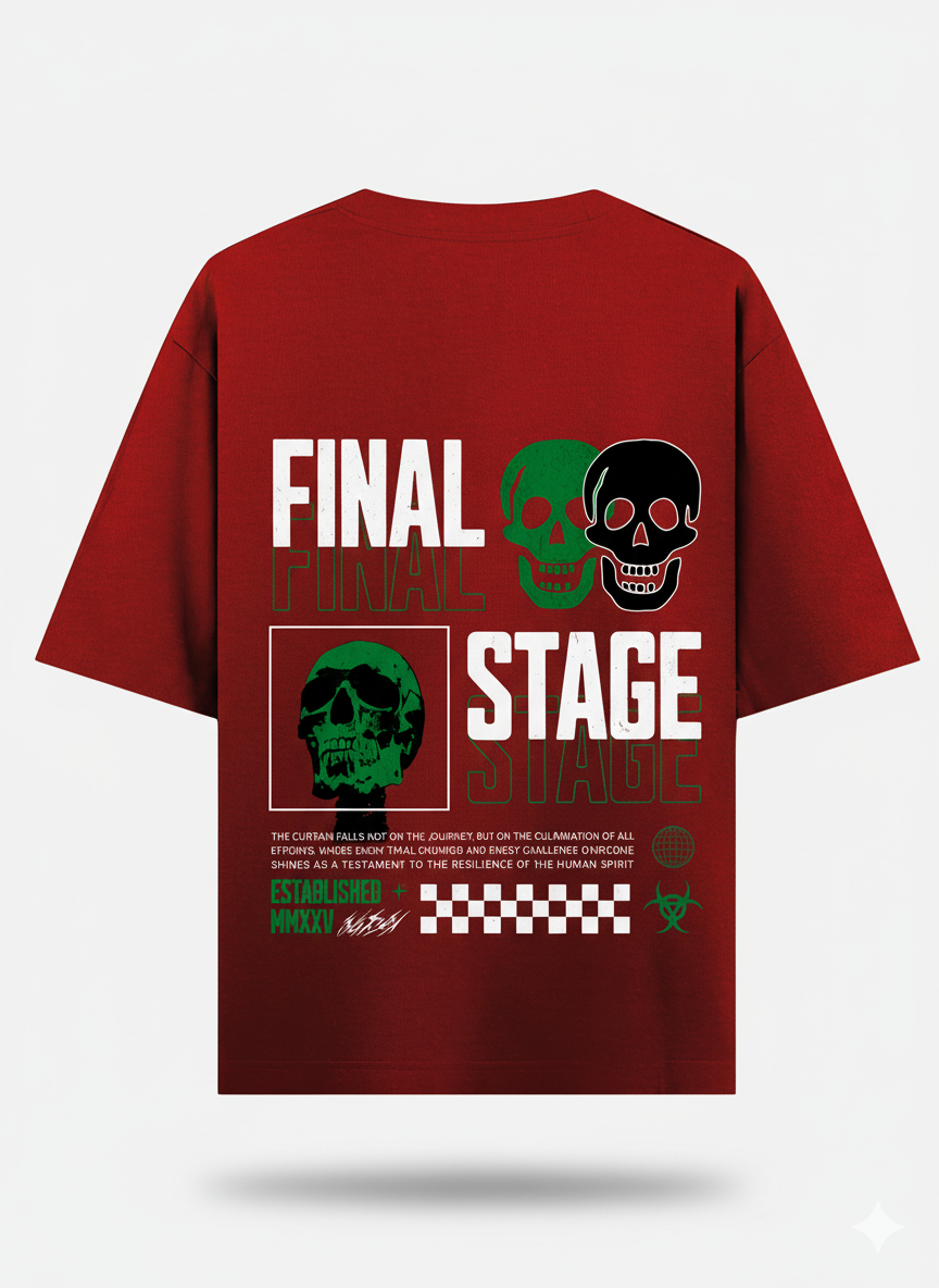 Push boundaries with the FINAL STAGE Oversized Graphic T-Shirt, a bold design that fuses streetwear with attitude. Featuring striking skull illustrations, layered typography, and symbolic graphics, this tee captures the essence of resilience and rebellion. The oversized fit ensures comfort while giving you that relaxed, edgy silhouette. Perfect for concerts, casual outings, or anyone who wants their outfit to speak louder than words.