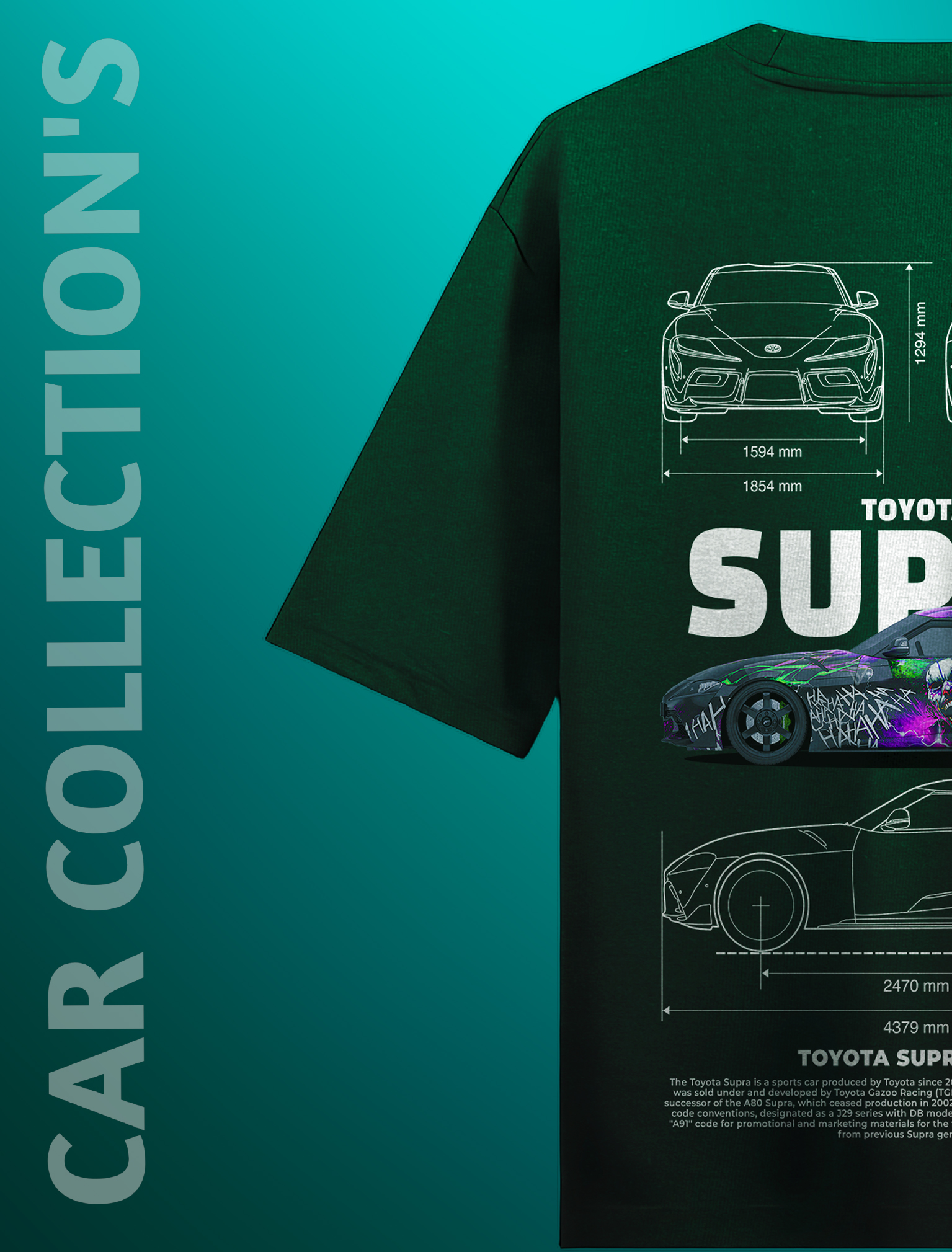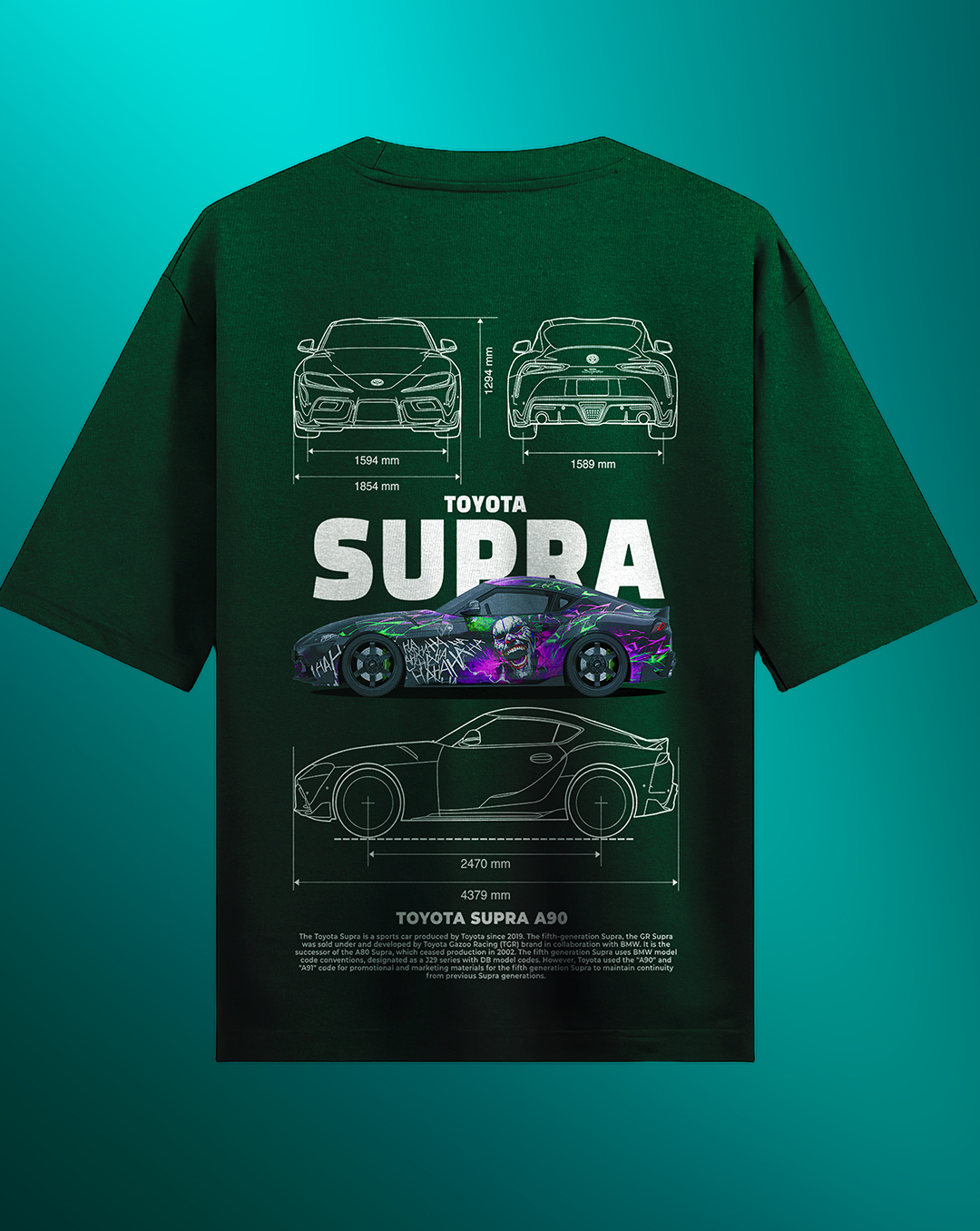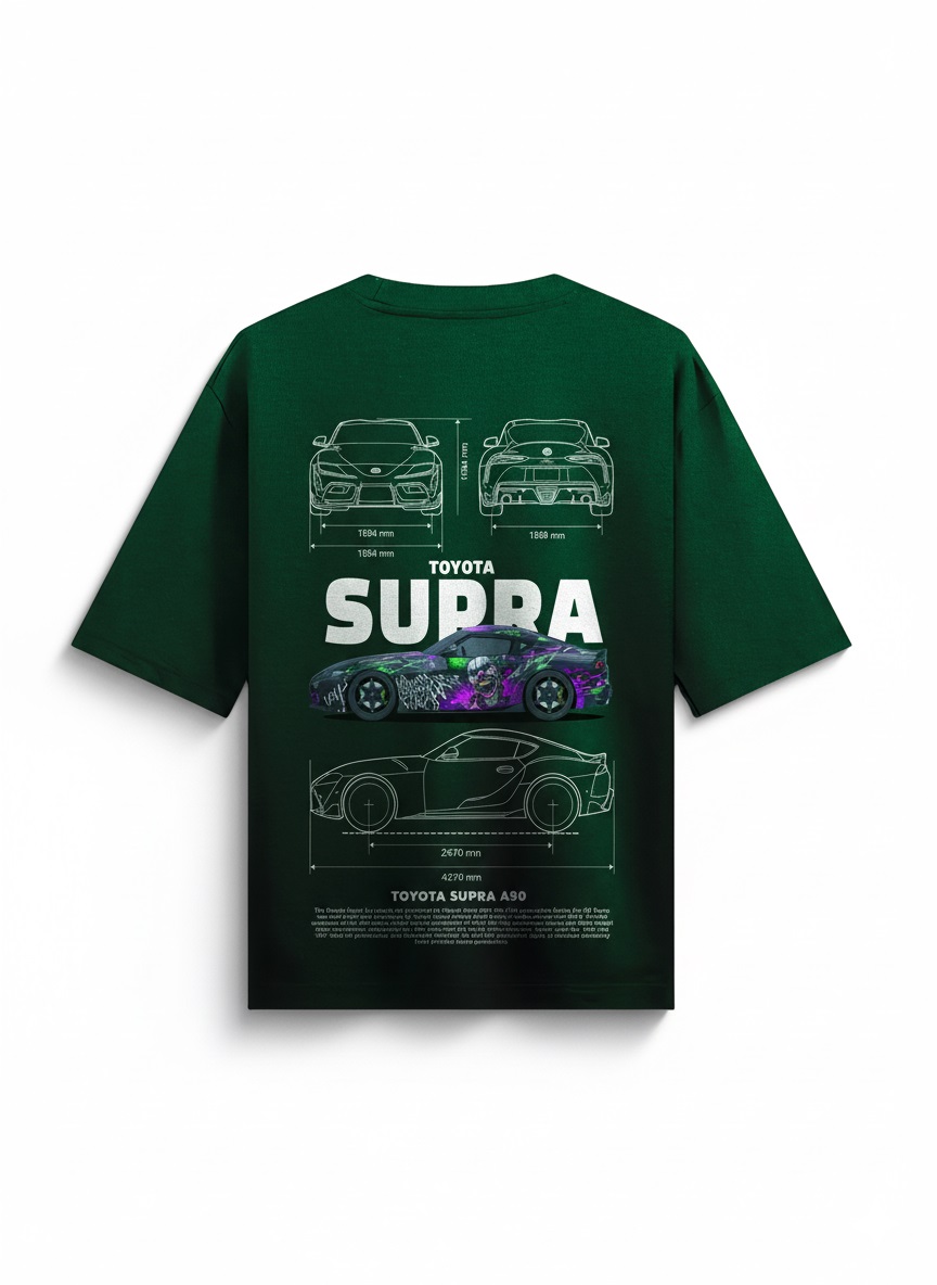 - Detailed back graphic featuring Toyota Supra A90 schematics and specs